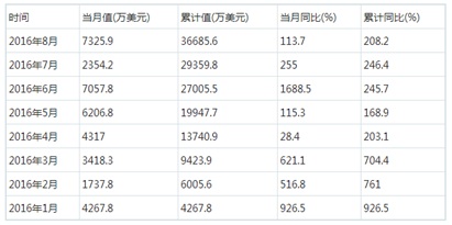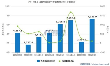 數(shù)據(jù)顯示,2016年1-8月中國(guó)風(fēng)力發(fā)電機(jī)組出口金額為36685.6萬(wàn)美元,同比增長(zhǎng)208.2%。其中,8月出口金額現(xiàn)今年最高峰,達(dá)到7325.9萬(wàn)美元。2016年1-8月中國(guó)風(fēng)力發(fā)電機(jī)組出口金額統(tǒng)計(jì)表如下表所示: