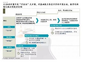 中國制造商能力參差不齊,現狀復雜。要在數字化轉型中成功獲取最大的價值,需要的不是“萬金油”式的解決方案,而是基于公司個體能力與業務需求量身定制的工業4.0路徑(見下圖)。
