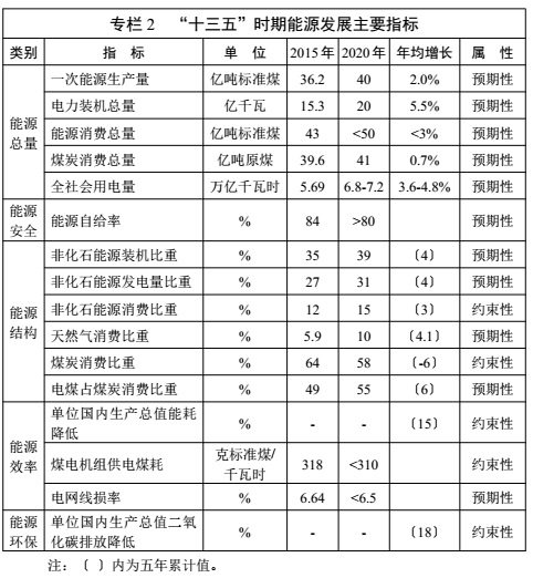 專欄 2 “ 十三五” 時期能源發展主要指標