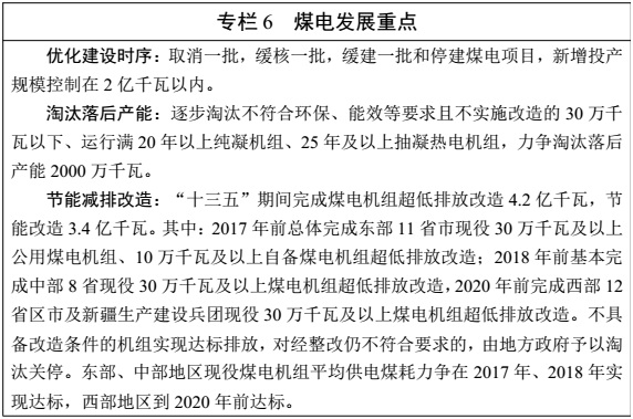 ——煤電。 優化規劃建設時序, 加快淘汰落后產能, 促進煤電清潔高效發展。 建立煤電規劃建設風險預警機制, 加強煤電利用小時數監測和考核, 與新上項目規模掛鉤, 合理調控建設節奏。 “ 十三五” 前兩年暫緩核準電力盈余省份中除民生熱電和扶貧項目之外的新建自用煤電項目, 采取有力措施提高存量機組利用率, 使全國煤電機組平均利用小時數達到合理水平; 后三年根據供需形勢, 按照國家總量控制要求, 合理確定新增煤電規模, 有序安排項目開工和投產時序。民生熱電聯產項目以背壓式機組為主。 提高煤電能耗、 環保等準入標準, 加快淘汰落后產能, 力爭關停 2000 萬千瓦。2020 年煤電裝機規模力爭控制在 11 億千瓦以內。
