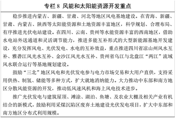 ——風電。 堅持統籌規劃、 集散并舉、 陸海齊進、 有效利用。 調整優化風電開發布局, 逐步由“ 三北” 地區為主轉向中東部地區為主, 大力發展分散式風電, 穩步建設風電基地, 積極開發海上風電。 加大中東部地區和南方地區資源勘探開發, 優先發展分散式風電, 實現低壓側并網就近消納。
