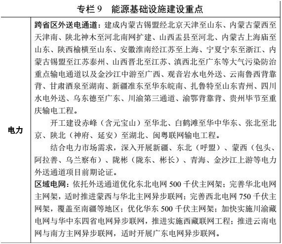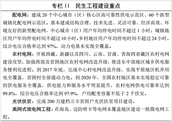 ——電網。 堅持分層分區、 結構清晰、 安全可控、 經濟高效的發展原則, 充分論證全國同步電網格局, 進一步調整完善電網主網架。 根據目標市場落實情況, 穩步推進跨省區電力輸送通道建設, 合理確定通道送電規模。 有序建設大氣污染防治重點輸電通道, 積極推進大型水電基地外送通道建設, 優先解決云南、 四川棄水和東北地區窩電問題。 探索建立靈活可調節的跨區輸電價格形成機制, 優化電力資源配置。 進一步優化完善區域和省級電網主網架, 充分挖掘既有電網輸送潛力, 示范應用柔性直流輸電, 加快突破電網平衡和自適應等運行控制技術, 著力提升電網利用效率。 加大投資力度, 全面實施城鄉配電網建設改造行動, 打造現代配電網, 鼓勵具備條件地區開展多能互補集成優化的微電網示范應用。 “ 十三五” 期間新增跨省區輸電能力 1.3 億千瓦左右。