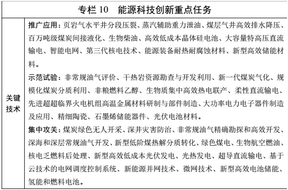強化企業創新主體地位,健全市場導向機制, 加快技術產業化應用, 打造若干具有國際競爭力的科技創新型能源企業。依托現有人才計劃, 強化人才梯隊建設, 培育一批能源科技領軍人才與團隊。推進重點技術與裝備研發。 堅持戰略導向, 以增強自主創新能力為著力點, 圍繞油氣資源勘探開發、 化石能源清潔高效轉化、 可再生能源高效開發利用、 核能安全利用、 智慧能源、 先進高效節能等領域, 應用推廣一批技術成熟、 市場有需求、 經濟合理的技術, 示范試驗一批有一定技術積累但工藝和市場有待驗證的技術, 集中攻關一批前景廣闊的技術, 加速科技創新成果轉化應用。