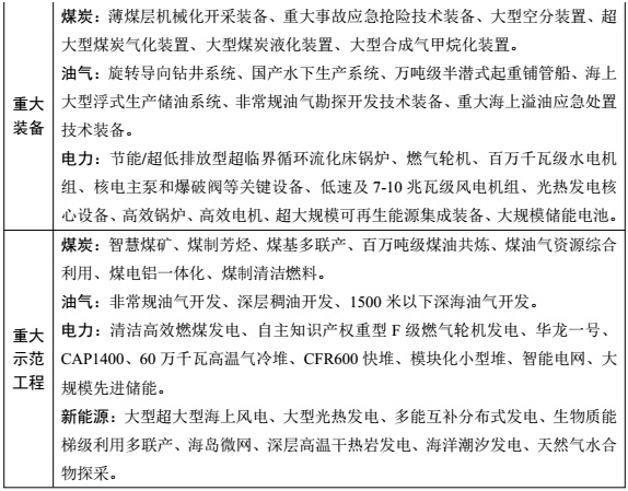 加強重點領域能源裝備自主創新, 重點突破能源裝備制造關鍵技術、 材料和零部件等瓶頸, 加快形成重大裝備自主成套能力, 推動可再生能源上游制造業加快智能制造升級, 提升全產業鏈發展質量和效益。實施科技創新示范工程。 發揮我國能源市場空間大、 工程實踐機會多的優勢, 加大資金、 政策扶持力度, 重點在油氣勘探開發、 煤炭加工轉化、 高效清潔發電、 新能源開發利用、 智能電網、 先進核電、 大規模儲能、 柔性直流輸電、 制氫等領域, 建設一批創新示范工程, 推動先進產能建設, 提高能源科技自主創新能力和裝備制造國產化水平。