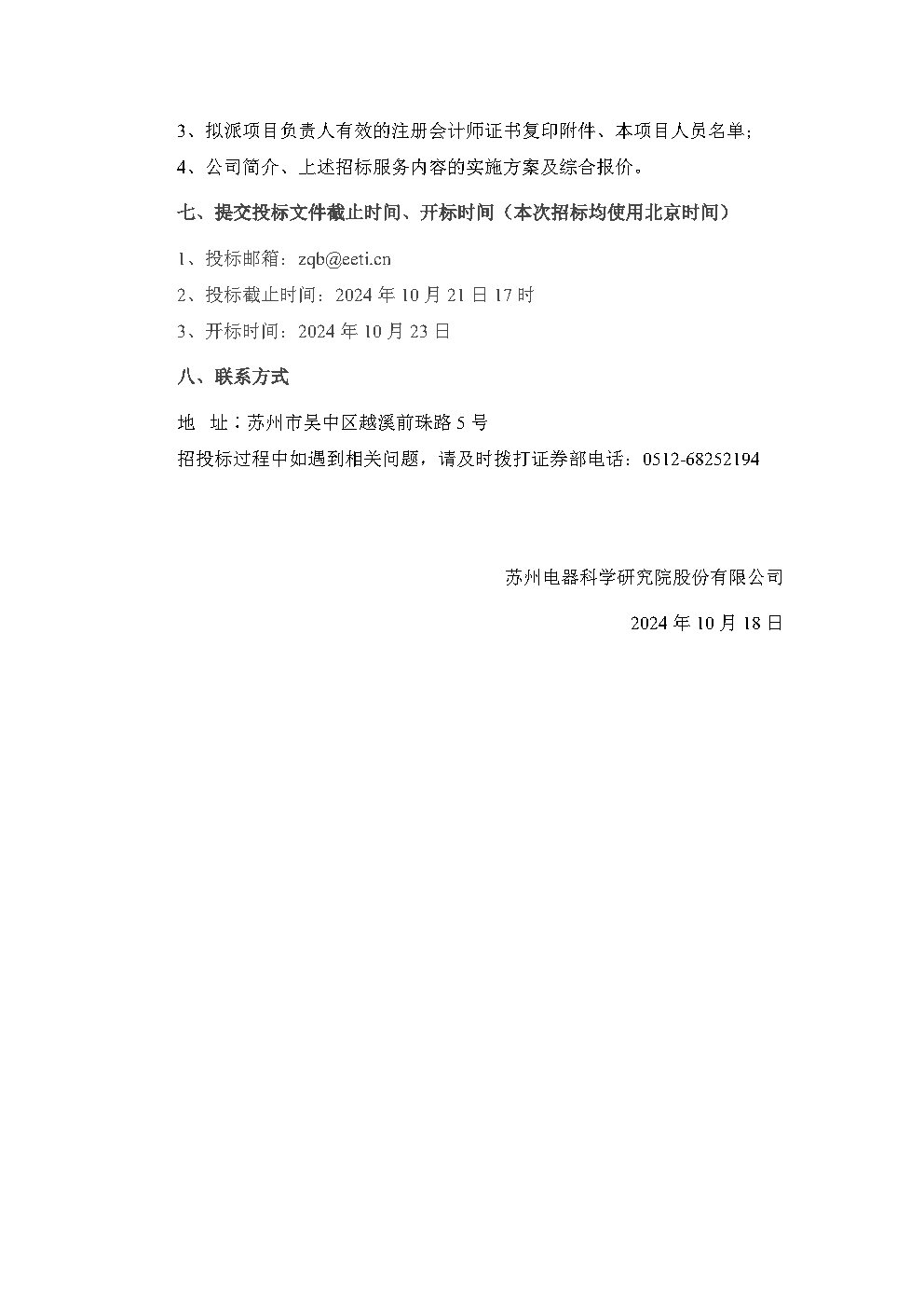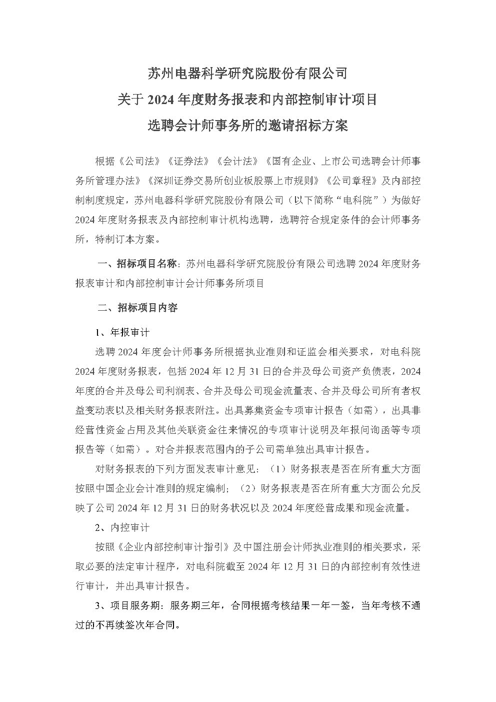 蘇州電器科學研究院股份有限公司關于2024年度財務報表和內部控制審計項目選聘會計師事務所的邀請招標方案